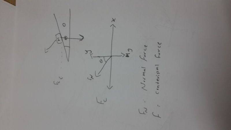 If it is then the normal force is perpendicular to the track ( ie perpendicular to centripetal force) then it would have no component providing the requisite force. Here is the figure in photo.Maged Saeed said:To the center of the circle NOT to the center of the x-direction ,, I didn't mean that ,,