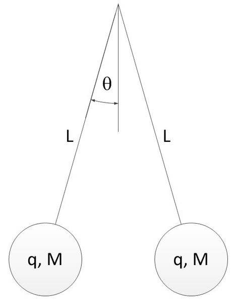 The discussion revolves around a basic electrostatics problem involving two charged objects of equal charge and mass, connected by strings of length L. The goal is to determine the angle θ formed by the strings due to the electrostatic forces acting on the objects.