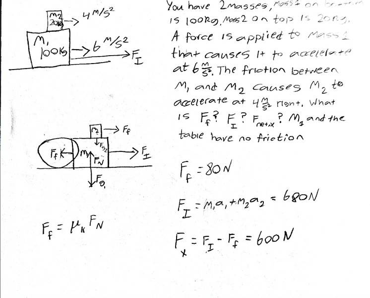 You have two masses moving across a frictionless surface, yet there is friction between the two masses. Mass 2 is on top of Mass 1 A force is applied to m1 which causes It to accelerate at 6 m/s2 and the friction between the two masses causes m2 to accelerate at 4 m/s2