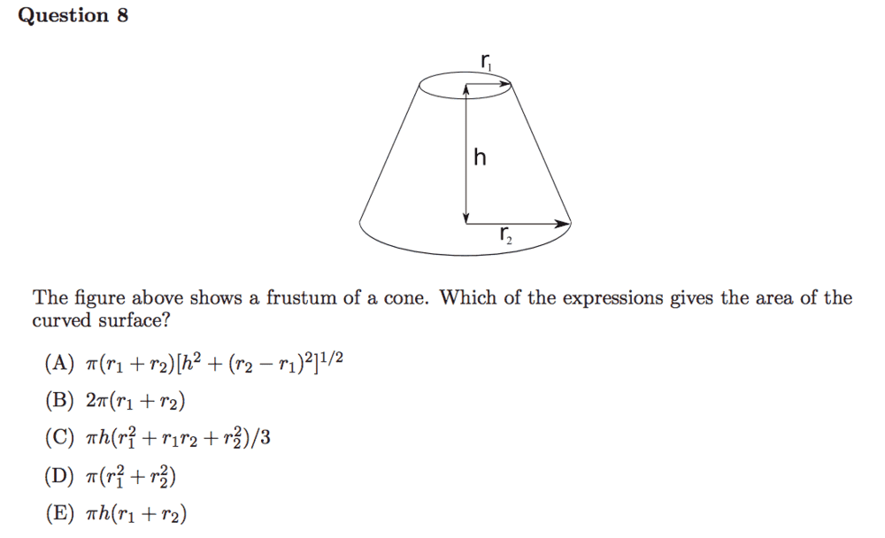 - Participants discuss the surface area formula in terms of pi, radius, and slant height, questioning how to derive it. Some suggest using integrals and the Pappus-Guldinus theorem, while others explore the implications of dimensions in the answer choices. There are also considerations of limiting behaviors and assumptions about the relationships between height and radius.