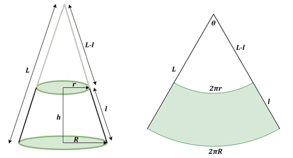 The discussion revolves around a geometry problem related to calculating the surface area of a frustum or a cone, with references to the Pappus-Guldinus theorem and various approaches to derive the formula for the surface area. Participants are exploring the relationships between the dimensions involved and the implications of different formulas presented in the problem.