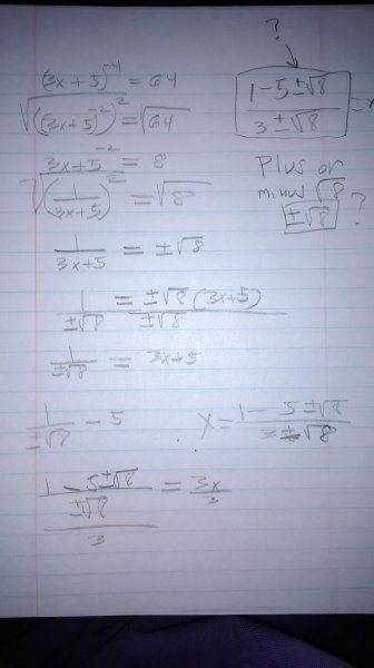 The discussion focuses on solving the equation (3x+5)^{-4}=64 from Serge Lang's Basic Mathematics. The user struggles with their algebraic manipulation, particularly in handling the square root and the signs involved. The correct approach involves rewriting the equation as X^4 = r^4, where X = 3x+5 and r = 1/√8, leading to two real solutions for x. The importance of clear notation and step-by-step presentation is emphasized for effective problem-solving.