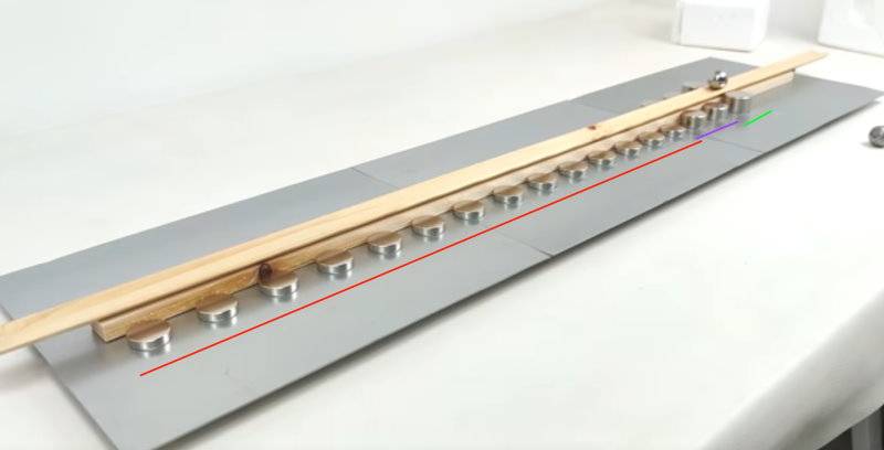 c) Could you technically just create a LONG line of those smaller magnets (red line) and have the spherical ball continuously increase in velocity if going in a straight horizontal line?