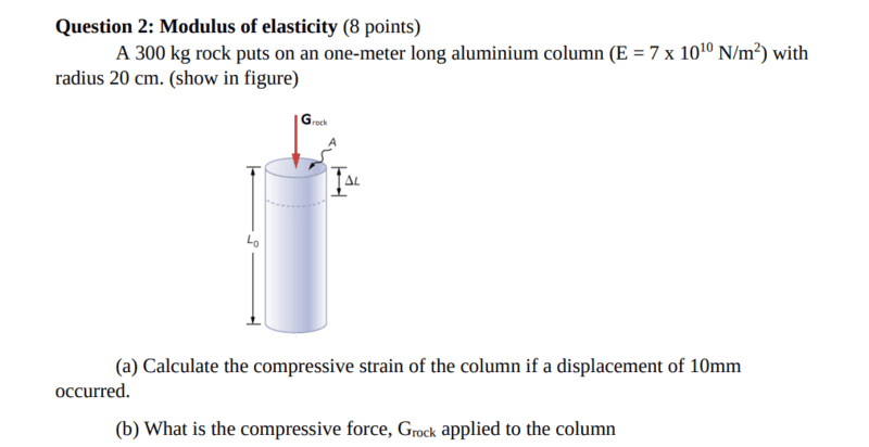 - A ##300## kg rock puts on an one-meter long aluminium column (##E = 7 * 10^{10} N/m^2##) with radius ##20## cm. (show in figure)