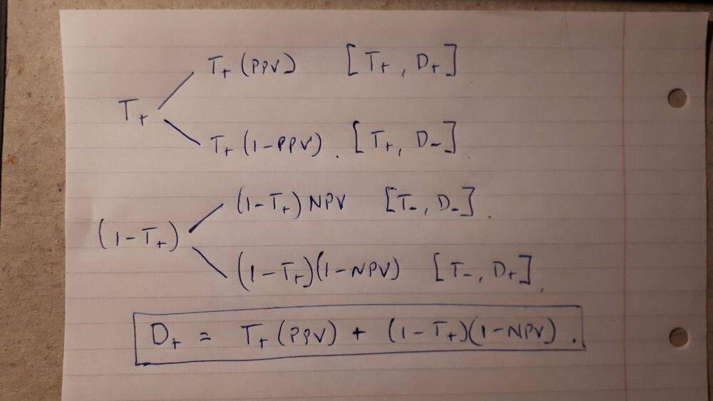 $$ P(D|T+) = \frac{P(T+|D)P(D)}{P(T+)} $$
