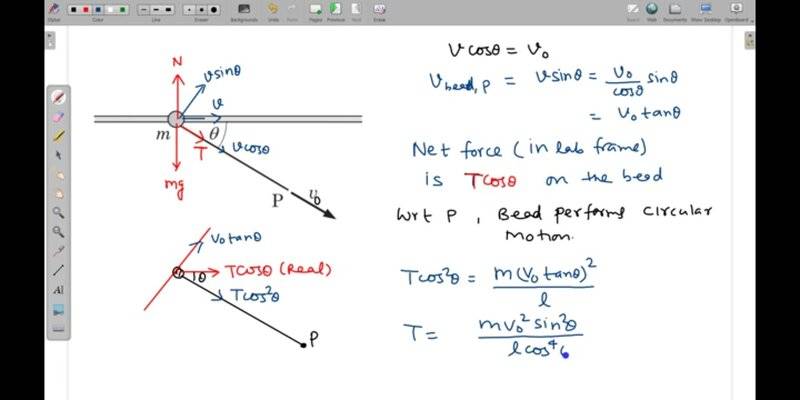 A bead of mass m, which can slide on a straight horizontal frictionless rod is being pulled by an ideal string of length ##l## such that the end P moved with velocity ##v_{0}## always directed along the thread.