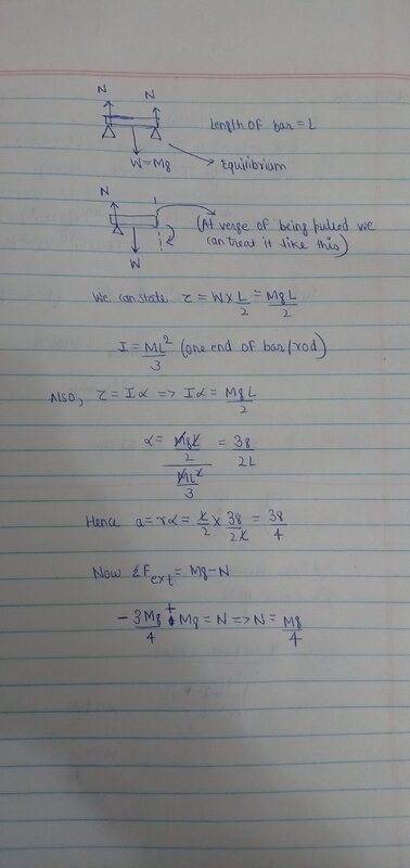 - A bar of length L is resting on two pivots. The weight of the bar is W (assume it is singularly concentrated at the middle) and it is in equilibrium as a result of the two pivots, both of which exert N normal reaction at their contact point. Since it is in equilibrium, the normal reaction N is equivalent to W/2. If one of the pivots is pulled from under the bar, what is the normal reaction at the moment it "just" starts to fall?