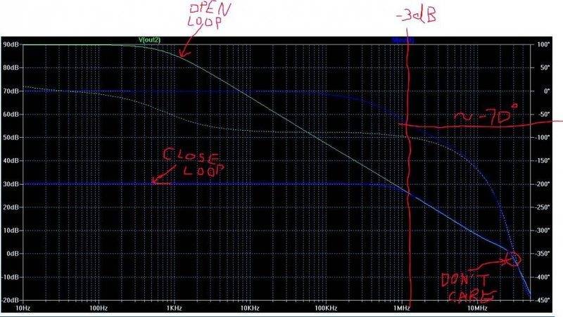 I want to verify: To look at stability, this is the only point I need to look at. This shows I have phase margin of 110deg( 180-70). So this circuit is stable given the open loop and closed loop gain phase plot. That I don't have to look at the 0dB crossover ( I circled "Don't care") at all.