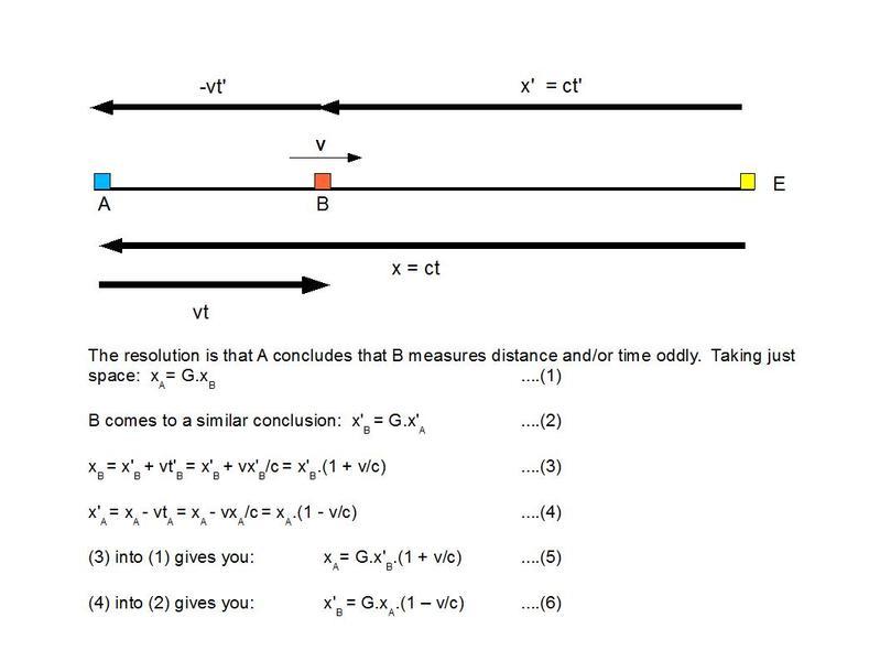 JesseM said:OK, I guess I didn't state it explicitly, but I thought it was obvious that if primed and unprimed was just supposed to distinguish between the two events E and E'--since you agreed with my statement "you were actually distinguishing between the two events using primed and unprimed (calling one event E and the other E', say)"--then if you also agreed that "xA represents the position in A's frame of the unprimed event E while xB represents the position in B's frame of the same unprimed event E", then naturally a corollary would be that "x'A represents the position in A's frame of the primed event E' while x'B represents the position in B's frame of the same primed event E' ". Is that not correct?