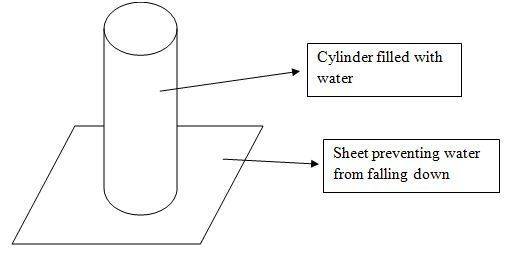 Consider a vertical relatively long cylinder of constant radius open at both ends. We fill this cylinder with water and prevent water from falling down by a certain sheet as seen in the figure.