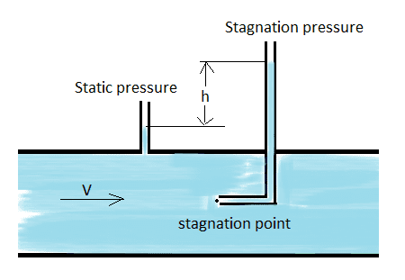 Apply Bernoulli Principle to the top (free surface) of the two pitot tubes (1 for static and 2 for dynamic with the points colored in red): $$\frac{p_1}{\rho_w g}=h+\frac{p_2}{\rho_w g}$$