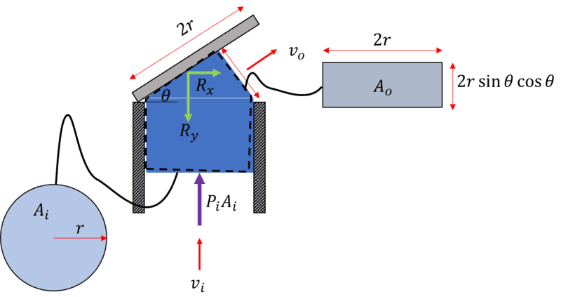 I then wanted to consider the case where the raincap is open at some angle theta. To do this, I used a simplified Reynolds Transport Theorem (RTT), took an angled control surface such that the flow entering from the pipe and the angled flow leaving after being deflected by the raincap are both perpendicular to the control surface. Assuming no losses (I'm looking for a relatively rough value here), I took the flow entering the control volume as being equal to the flow exiting. For the flow entering, there is only a y-component (v), for the flow existing, I found the x and y components with respect to theta. Completing the equation, I get a very similar result to what I had when using Bernoulli's principle, however there is a factor of 1/2 missing. This is more obvious if you assume theta is very small and sin(theta) approaches 0.