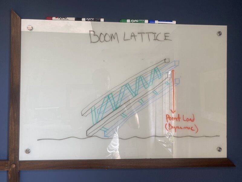 I’m attempting to determine the material specifications of the tube cords and lattice dimensions to operate the fully cantilevered working load, say 400 pounds, with a high safety factor (7x failure) to account for dynamic force and fabrication quality.