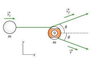 Jeanette is playing in a 9-ball pool tournament. She will win if she sinks the 9-ball from the final rack, so she needs to line up her shot precisely. Both the cue ball and the 9-ball have mass , and the cue ball is hit at an initial speed of . Jeanette carefully hits the cue ball into the 9-ball off center, so that when the balls collide, they move away from each other at the same angle from the direction in which the cue ball was originally traveling (see figure). Furthermore, after the collision, the cue ball moves away at speed , while the 9-ball moves at speed . (Intro 1 figure)