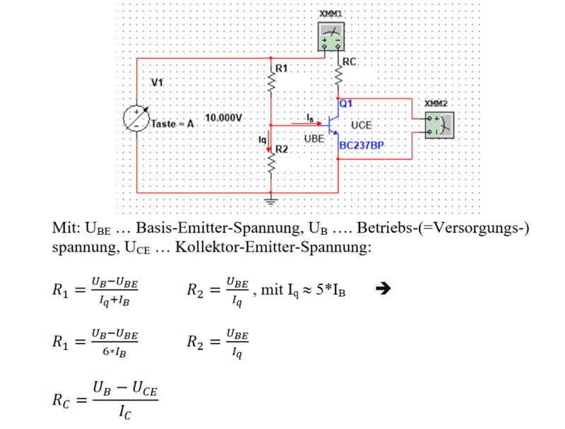 The discussion centers on the equations used in BJT emitter circuits, specifically the definitions of voltages and currents. The correct equation for R1 is derived from the source voltage (Ub = 10V) minus the base voltage, divided by the sum of Iq and Ib. The confusion arises from inconsistent definitions of voltage, particularly the use of Ub for source voltage rather than base voltage. The equations presented are confirmed to be correct, emphasizing the importance of clear definitions in circuit analysis.