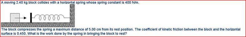 The block compresses the spring a maximum distance of 5.00 cm from its rest position. The coefficient of kinetic friction between the block and the horizontal surface is 0.450. What is the work done by the spring in bringing the block to rest?
