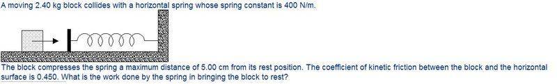 The block compresses the spring a maximum distance of 5.00 cm from its rest position. The coefficient of kinetic friction between the block and the horizontal surface is 0.450. What is the work done by the spring in bringing the block to rest?