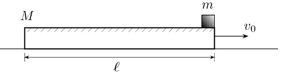 - A wooden slab, with a mass of ##M = 80 kg##, initially moves with an uniform rectilinear motion, on a horizontal surface devoid of friction. The slab has a velocity ##v_{s,i}=6 m/s##. At a certain instant, a block, assumed to be a point mass with a mass of ##m = 12 kg##, is placed on the right end of the slab. The block initially has a velocity of zero, relative to a frame of reference fixed to the horizontal surface. Knowing that there is a frictional force characterized by the coefficient of kinetic friction ##μ_k= 0.3## between the slab and the block, determine: