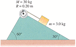 A cord connected at one end to a block which can slide on an inclined plane has its other end wrapped around a cylinder resting in a depression at the top of the plane as shown in the figure. Determine the speed of the block after it has traveled 1.70 m along the plane, starting from rest for the following circumstances.