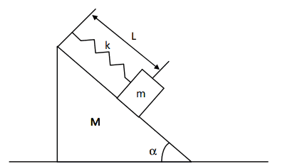 - A body of mass 𝑚 slides without friction on the flat surface (which is inclined at an angle 𝛼 relative to the horizontal) of a block of mass 𝑀 under the action of a spring, as shown in the figure. This spring, with a spring constant 𝑘 and a natural length 𝐶, has its ends fixed respectively to the body of mass 𝑚 and to the block. In turn, the block can slide without friction on the flat and horizontal surface on which it rests. The body is pulled up to a position where the spring is stretched to a length 𝐿 (𝐿 > 𝐶), such that, when released, the body passes through the position where the elastic force is zero. In this position, what is the magnitude of the velocity of the block in terms of L, C, m, M, g (acceleration of gravity), 𝛼, and k?