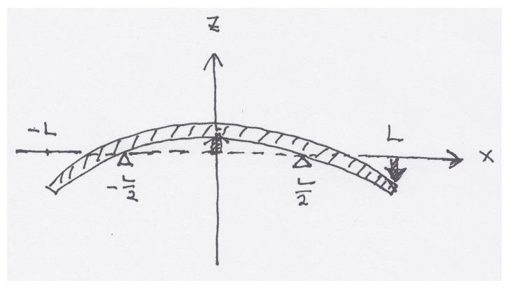 A plate with length 2L is placed on supports at x = L/2 and x = - L/2. The plate is deforming elastically under its own weight (maximum displacement bowing up at x = 0). Both ends of the plate are free boundaries.