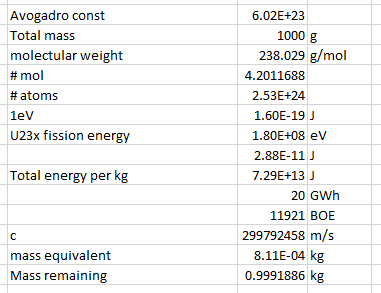 - What types of materials and how much mass is left behind if say 1kg of "natural" Uranium (99.3% U238, 0.7% U235) or Thorium (99.98% Th232) is consumed in a breeder capable of consuming 100% of the breed-able/fissionable material? (Maximum energy extraction would be the goal, not burning existing transunranic waste)