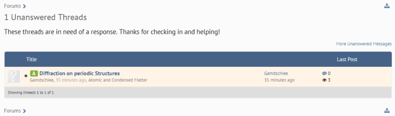 It sort of is possible in the homework forums. Sometimes an advisor will mark it as solved. But inside that list it is not possible at the moment.aphirst said:Is it possible to introduce a distinction between "no replies" and "unanswered"? What I mean is, I made a thread the other day, and for reasons of clarity made a 2nd post, which now means my thread no longer shows up in "unanswered threads" despite in no way actually being answered. It seems "clear" to me that, even if a thread has "replies", if they're all the OP, it's still part of the "question asking". (In my case I was still within the Edit timeframe, so I could have appended Post #2 to it, but let's not forget that the Edit window is, for its own reasons, tightly restricted.)