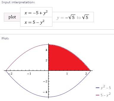 Find the are of the region lying to the right of x=y^2-5 and to the left of x=5-y^2