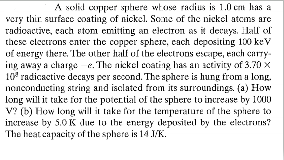 - A solid copper sphere whose radius is 1.0 cm has a very thin surface coating of nickel. Some of the nickel atoms are radioactive, each atom emitting an electron as it decays. Half of these electrons enter the copper sphere, each depositing 100 keV of energy there. The other half of the electrons escape, each carrying away a charge -e. The nickel coating has an activity of 3.70 X 10^8 radioactive decays per second. The sphere is hung from a long, nonconducting string and isolated from its surroundings. (a) How long will it take for the potential of the sphere to increase by 1000V? (b) How long will it take for the temperature of the sphere to increase by 5.0 K due to the energy deposited by the electrons? The heat capacity of the sphere is 14 J/K.