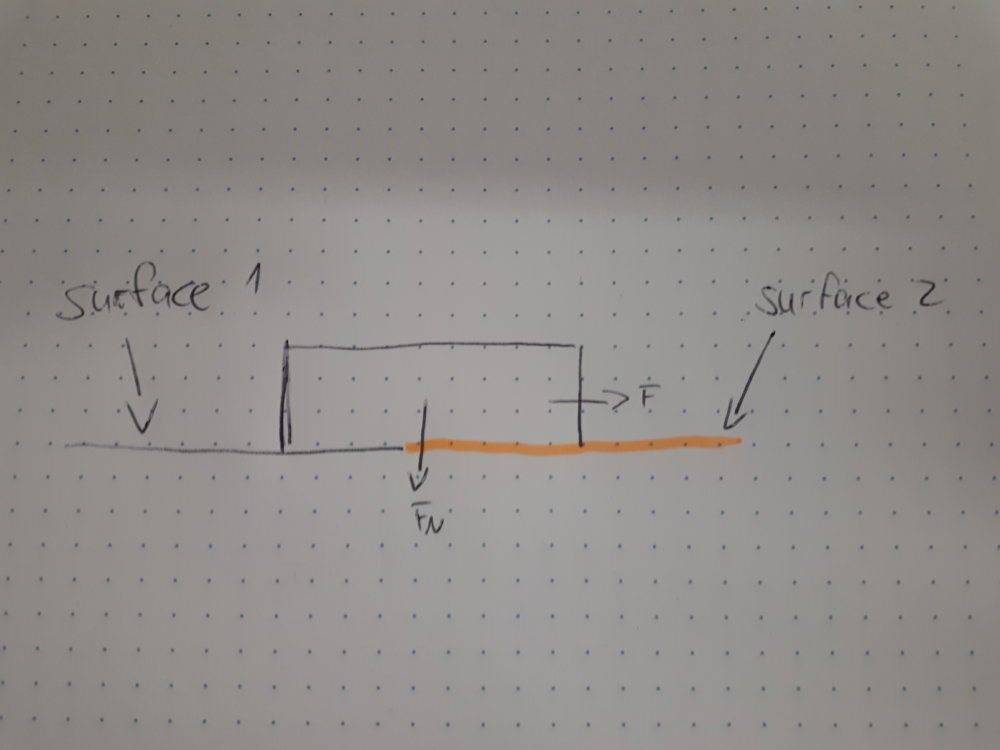 I have a cuboid on two different surfaces. I am applying a changeable force F to it, but it should stay on the same point / in static friction. I now want to calculate the combined (static) friction coefficient μ_combined out of the two known coefficients of cuboid to surface 1 μ_1 and cuboid to surface 2 μ_2. Forces (and if I forgot anything else) can be assumed to be known, it's just about calculating the combined friction coefficient.