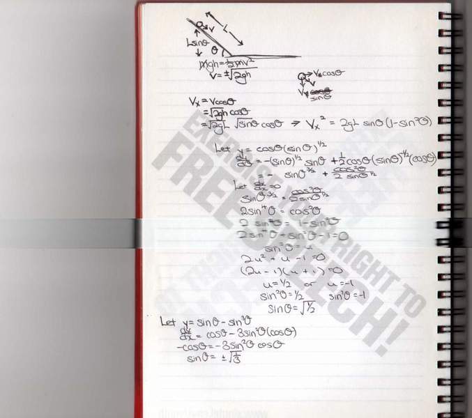where h=LsinX. So i equate (cosX)sqrt(sinX)=y and differentiate once and equate to 0. The answer i got was X=45 which is wrong. However, if i change the equation to V^2=2gL(sinX)(cosX)^2, the angle i got was arcsin (1/sqrt3) which is about 35. Why is this so??