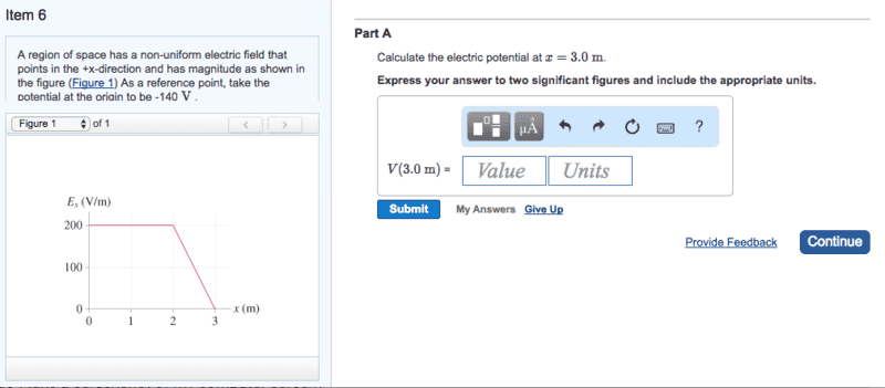 So I attempted to take the integral from 0 to 3 of the graph seen, but I did not know what E and dr were. I searched the web and found the closes thing being the potential difference given at x = 0. This is where I got lost and could not figure out what I needed to put in for dr and E fully. I know I have to integrate somehow, but with what? I just know the boundaries are 0 to 3, but everything else is confusion.
