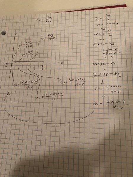For instance, when V becomes dV in step 2, Q logically also becomes dq. But why does r not become dr? The radius would vary just like the charge would, yet it is left as a constant r. In the next step, I subbed in (d+x) for r as it was done in the Chegg solution. I understand that d + x represents the distance from point A to the origin and then the addition of a given x value, but I still don't entirely understand how it is implemented here. Can we sub this in because it is a function of x and we will be integrating with respect to x? Did we leave r as r rather than changing it to dr to allow for this substitution to be made?