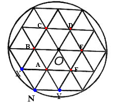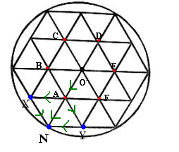 In the attached image the outer circular wire is represented as N . We have to find the equivalent resistance between O and N . Consider a battery of voltage V between O and N . From O there are six similar paths OA ,OB,OC,OD,OE,OF . Now , All six points would be equipotential . Consider any point , say A . No current would flow between A and B . From A there are three paths AX, AN,AY . AX and AY are symmetric w.r.t to AN so current would flow from A to X and then from X to N . Similarly current would flow from A to Y to N . Current would flow directly from A to N .I have drawn the currents in attached image .