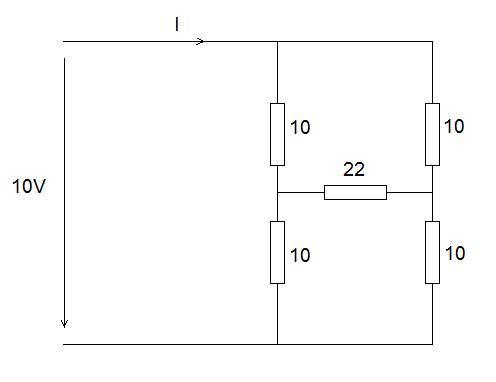 i have the following circuit and I'm tryingto calculate I. (the values shown by the resistors are all ohms.) i can do this fine normally, but the addition of a resistor in the middle just complicates things. can anyone help me out? a picture of the crcuit has been attached.