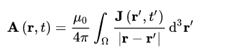 - Another participant clarifies that in magnetostatics, time variables can be ignored and explains that \( A \) is calculated by integrating the contributions from all current elements \( J(r') \) at different positions \( r' \).
