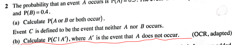 ##P(C|A')=\dfrac{P(C)-P(A∩C)}{P(A')}=\dfrac{0.42-(0.3×0.42)}{0.7}=\dfrac{0.294}{0.7}=0.42## which is wrong according to textbook solution.