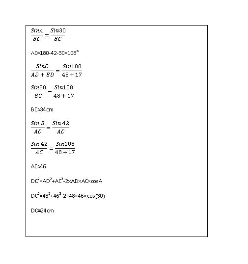 The discussion focuses on calculating the length of side DC in a triangle given the lengths AD (48 cm) and BD (17 cm). Participants confirm that the calculations are correct and suggest using the sine and cosine formulas for verification. Additionally, they recommend checking the calculation using side BC and angle C, which is 42 degrees, as an alternative method to ensure accuracy.