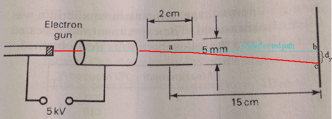 Calculate the deflection sensitivity (deflection of spot in mm per volt potential difference) of a cathode ray tube from the following data: electrons are accelerated by a potential difference of 5.0 kV between cathode and annode; length of deflector plates = 2.0 cm; separation of deflector plates = 5.0 mm; distance of mid point of deflector plates from screen = 15.0 cm.