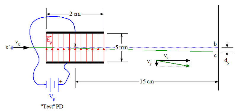 I found E = V / d = 5000 / 0.005 = 1 000 000 V and that's it. Not much clear or basic information on the deflection of spot in mm / V can be found online. And I don't think it's as easy as 5 mm / 5000 V.