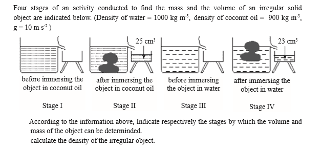 - One participant provides a calculation for the mass of the object based on its immersion in water and coconut oil, leading to a density calculation that suggests the object's density is less than that of water and greater than that of coconut oil.