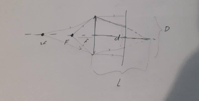 - The thin, circular convex lens is placed in an opaque bracket perpendicular to the optical axis. Behind the lens is build a shade perpendicular to the optical axis at a distance ##l##. By placing a spot light source in the subject focus of the lens, a circle of light with a diameter of ##D## is formed on the shade. Moving the point source within twice the distance of the lens creates a circle of a diameter ##d##. Detrmine a focal length of the lens.