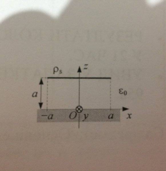 A very thin plane of length ##2a## is placed in the air at height ##a## above the conducting surface. The plane is charged on its surface and the expression for it's surface charge density (##ρ_s##) is given by ##ρ_s=ρ_{s0}*\frac{x}{a}## and ##ρ_{s0}## is some constant.