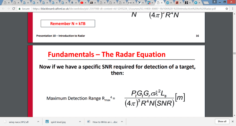 Radar Max range = ((Pt*(G^2)*RCS*(Wavelength^2)*Ls)/((4pi^3)*(r^4)*SNR) )^1/4