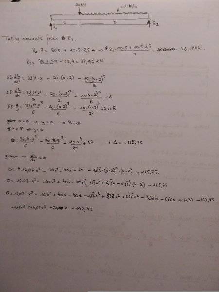 The discussion revolves around calculating the maximum deflection of a simply supported beam subjected to a point load and a uniformly distributed load (udl). Participants explore various methods and equations related to beam deflection, including moment calculations and the use of different mathematical approaches.