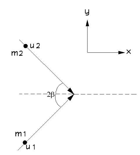 The direction of the CM will be inferred from a drawing or from the calculated angle. So as shown in the drawing - two particles collide at an angle of ##2\beta##. The x-axis exactly bisects this collision angle so the angle of interest is ##\beta##. The masses of the particles are ##m_1,m_2## and the velocities are ##u_1,u_2##.