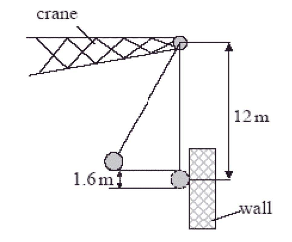 - A solid iron ball of mass 770kg is used on a building site. The ball is suspended by a rope from a crane. The distance from the point of suspension to the centre of mass of the ball is 12m. The ball is pulled back from the vertical and then released. It falls through a vertical height of 1.6m and strikes a wall. Calculate the tension in the rope just before impact.