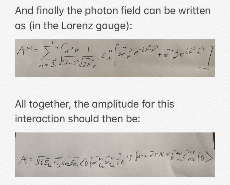 So I’m trying to compute the probability amplitude of an electron with momentum p1 and a positron with momentum p2 annihilating into a photons with momenta q1 and q2.