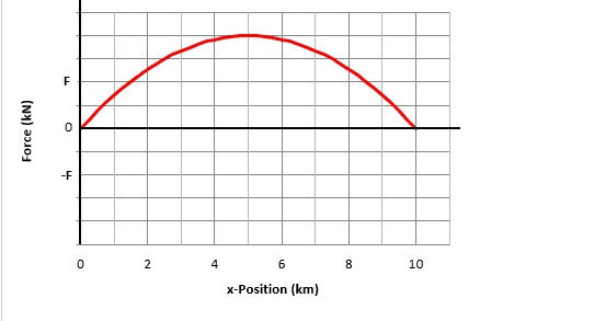 In gravity-free interstellar space, a spaceship fires its engines to speed up. The total thrust of the engines as a function of position is shown in the graph below. F on the graph represents 79 kN of thrust. The rocket's mass is 11500 kg. Note the units on the graph - kN and km! The rocket's initial velocity is 1650 m/s.