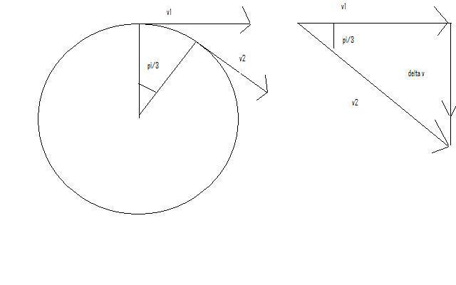 BvU said:The angle doesn't just look like that, it IS. Remember the change in Θ = 2π/30 . 5 . The change in vector velocity v is what you need to change velocity vector v1 into vector v2. That is v1 -v2. That is the red vector: When you take add v1 and add the red vector you end up at v2. Now two equal length sides at π/3 make an equilateral triangle. So the length of the red vector is also 5 π m/min.
